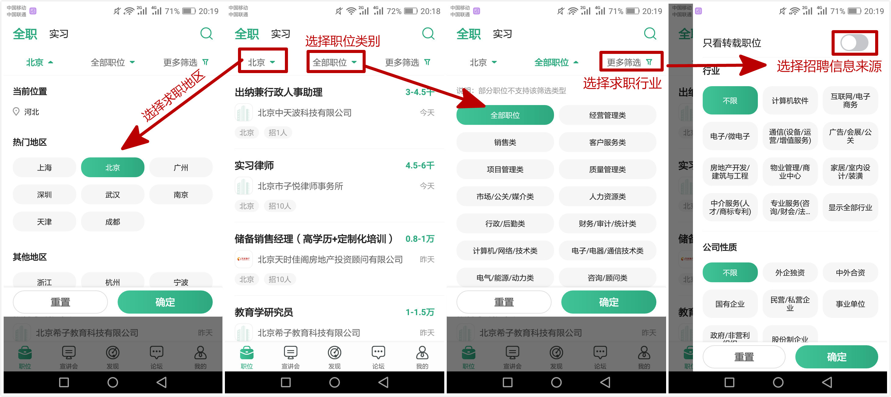 应届生求职的“职位”tag页面都有上图所示的下拉选框,包括对职位、行业、地区的选择,在“全职”选项卡中筛选信息页面交互如下: