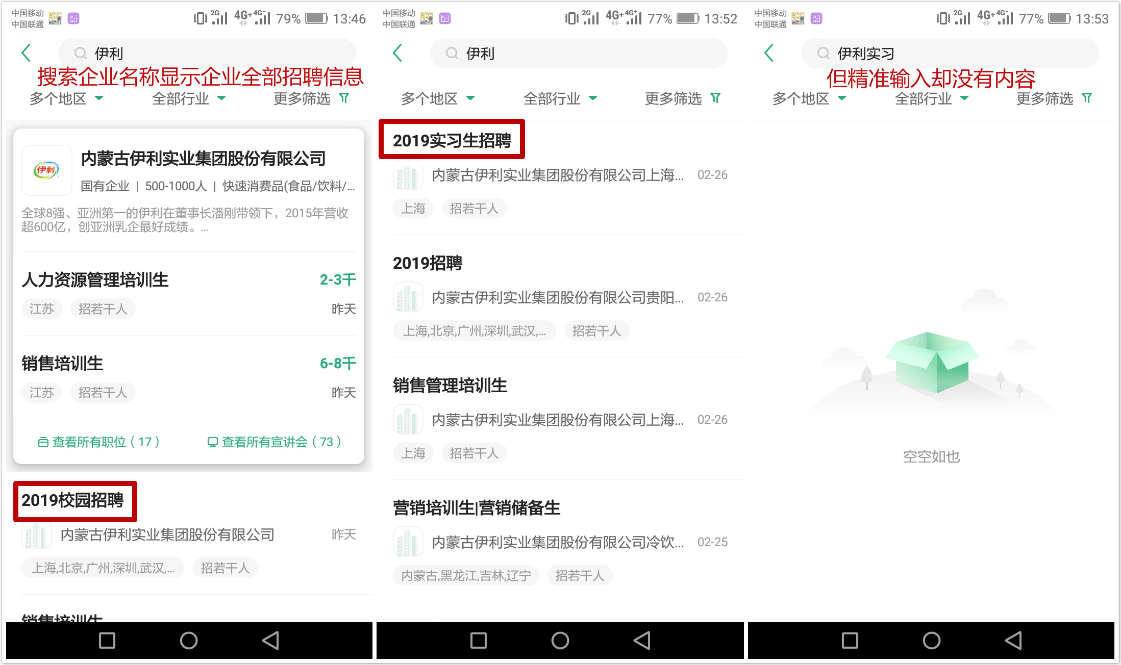 而在搜索框输入“伊利实习”这样的精准关键词反而查询不到任何信息,这点体验让已有目标企业的求职者感到操作上不方便