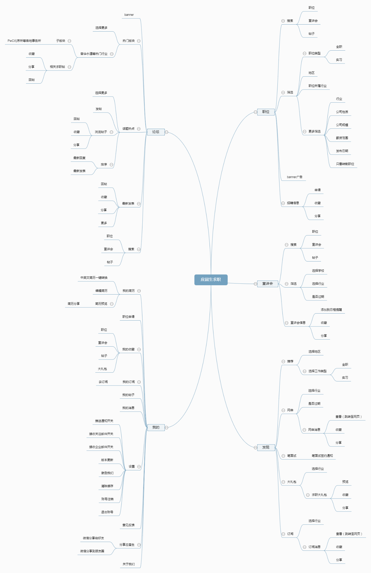六、产品功能结构应届生求职APP主要分为五大功能模块:①职位 ②宣讲会 ③发现 ④论坛 ⑤我的。五大模块均可通过底部的tag进入,产品功能结构如下: