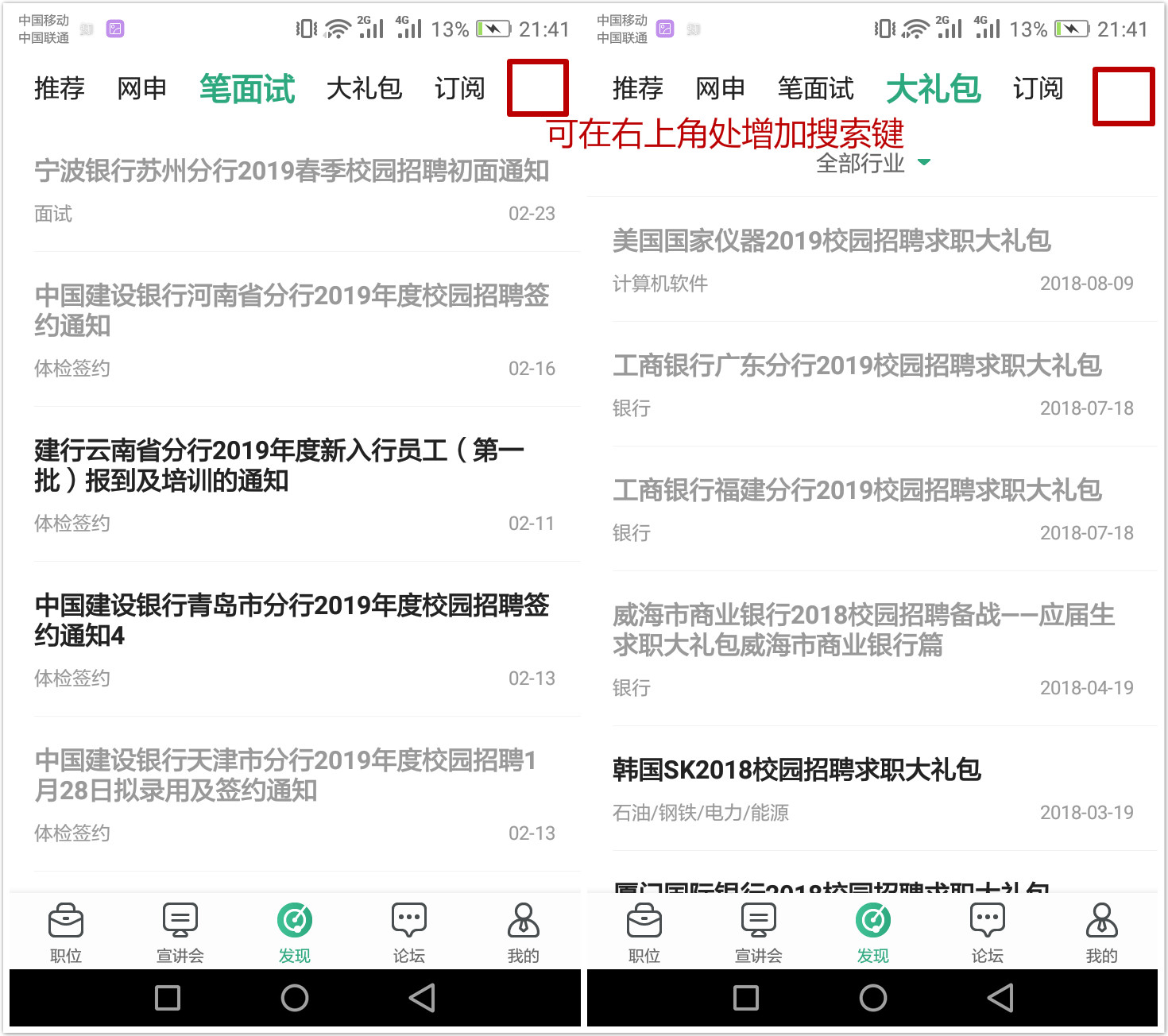 改进建议:在“笔面试”“大礼包”选项卡页面内增加搜索功能,用户可在搜索栏输入求职单位名称有针对性的查找到相关笔面试通知或签约通知以及相应单位的求职大礼包。