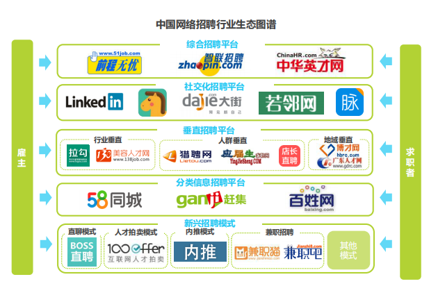 中国网络招聘平台主要分为五大模式,分别是从雇主到求职者的综合招聘,社交化招聘,垂直招聘,分类信息招聘,新兴招聘。