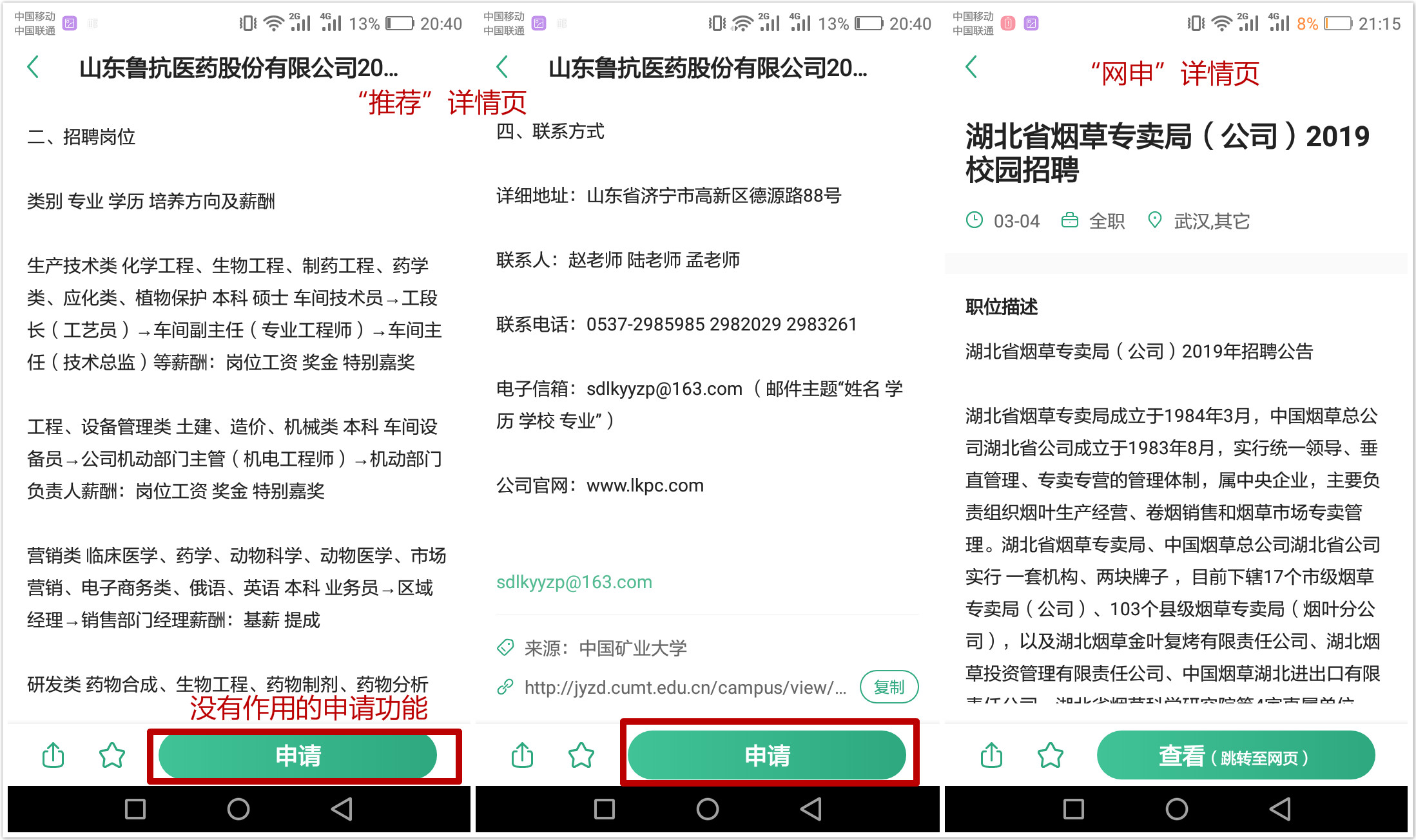 改进建议:将那些“推荐”详情页中没有提供明确职位但提供了联系邮箱的页面底部“申请”按钮设置成不可点击,提示用户用邮箱进行投递