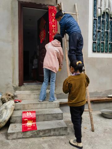 一人扶着梯子在贴春联 贴窗花