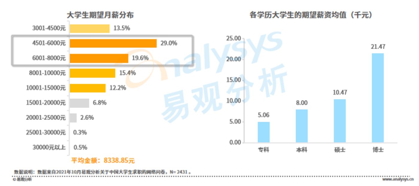 就业期望:大学生整体薪资期望较高,各学历期望差异显著