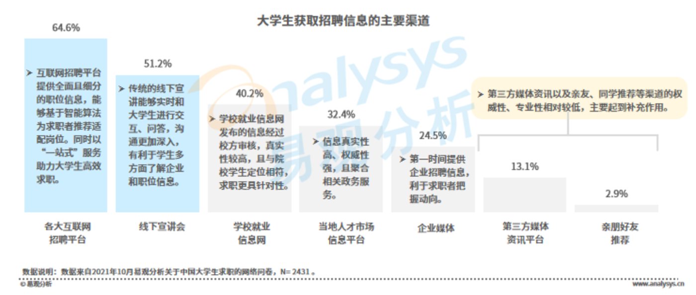 信息渠道:互联网招聘平台及线下宣讲会为最主要的渠道