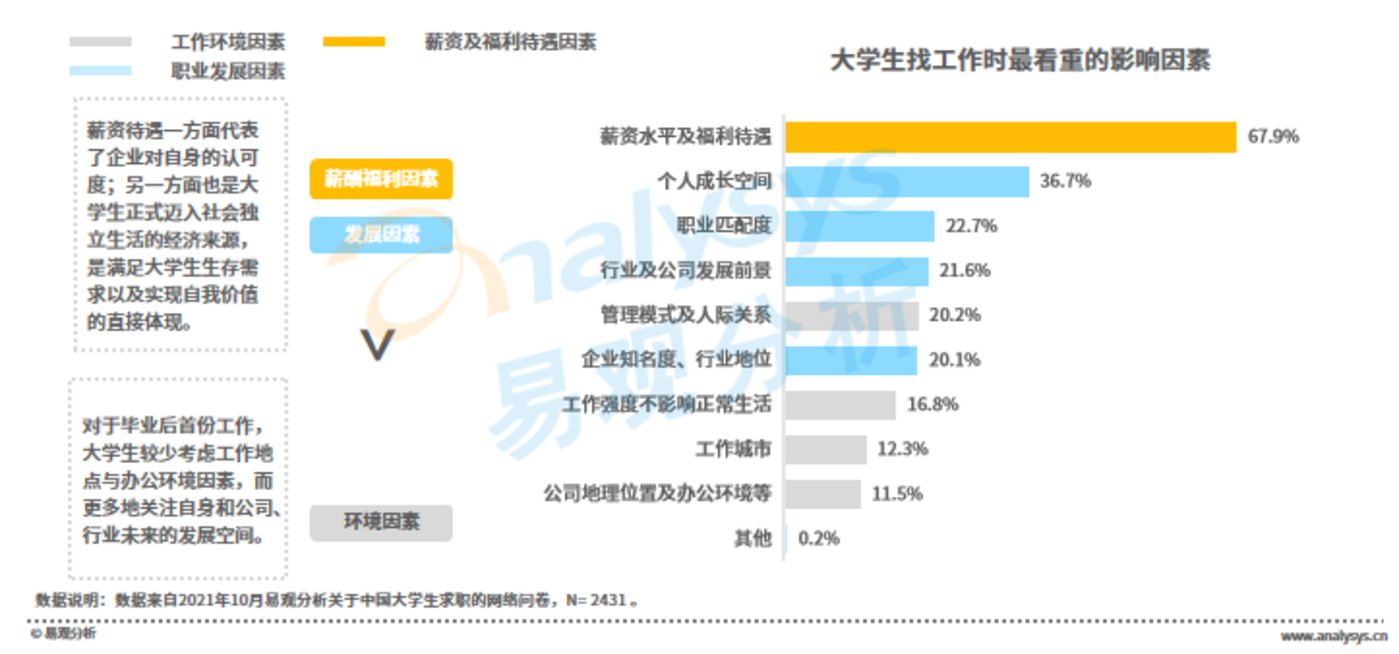 据调研结果:近68%的大学生看重工作的薪资水平及福利待遇,36.7%的大学生关注工作的个人成长空间。超过20%的大学生在求职时也会考虑工作的职业匹配度、行业与企业的发展前景、企业的管理模式及人际关系因素。