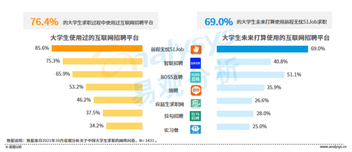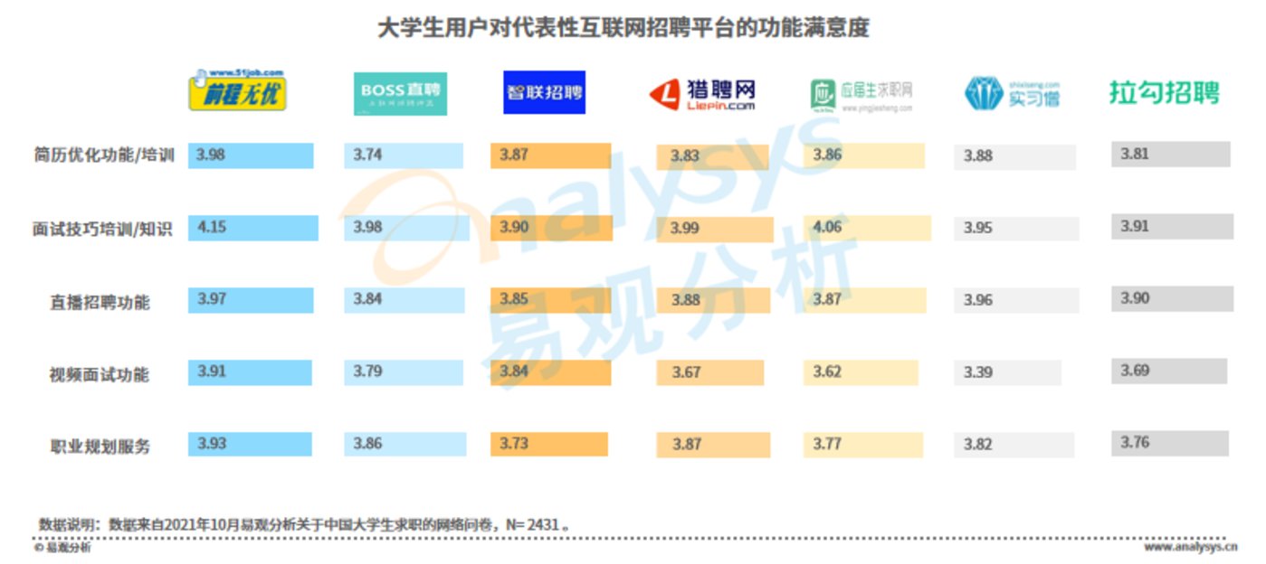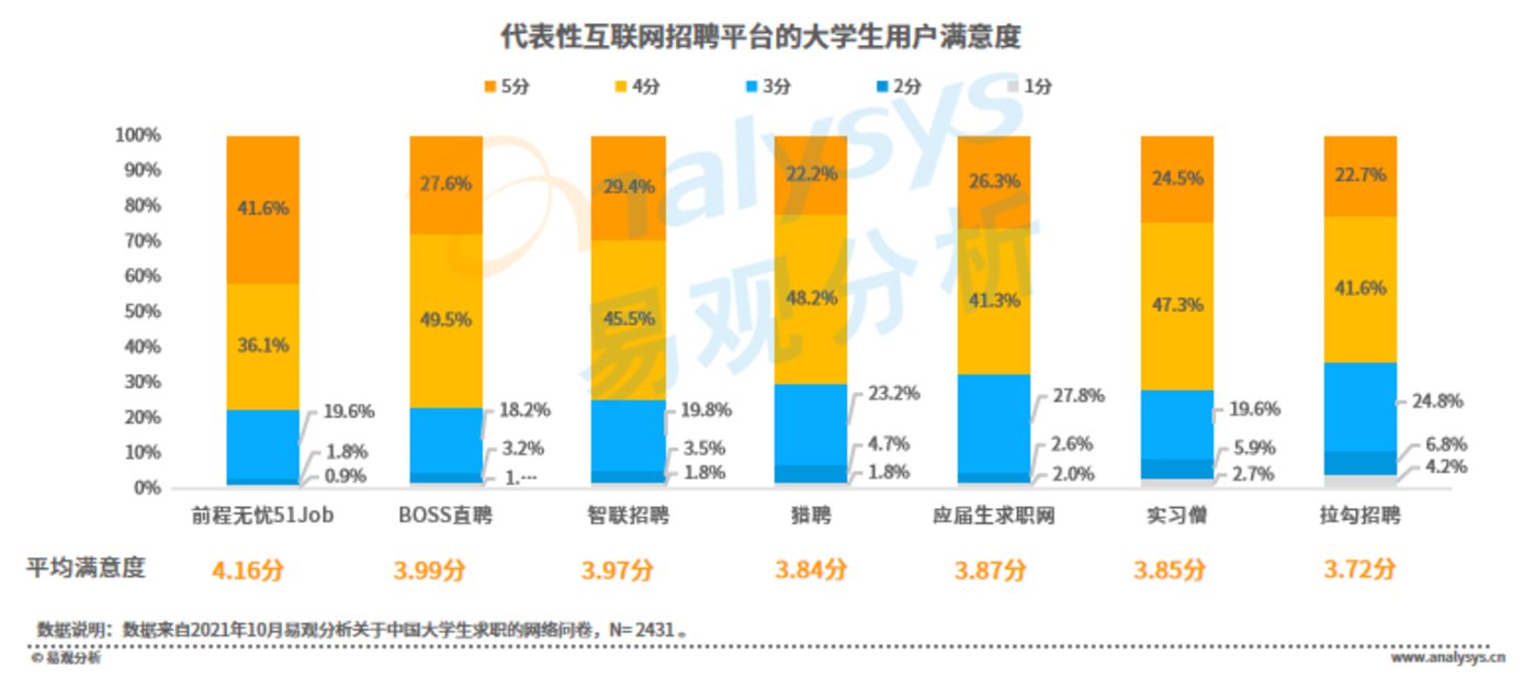 满意度:代表性平台大学生用户满意度较高,前程无忧相对领先
