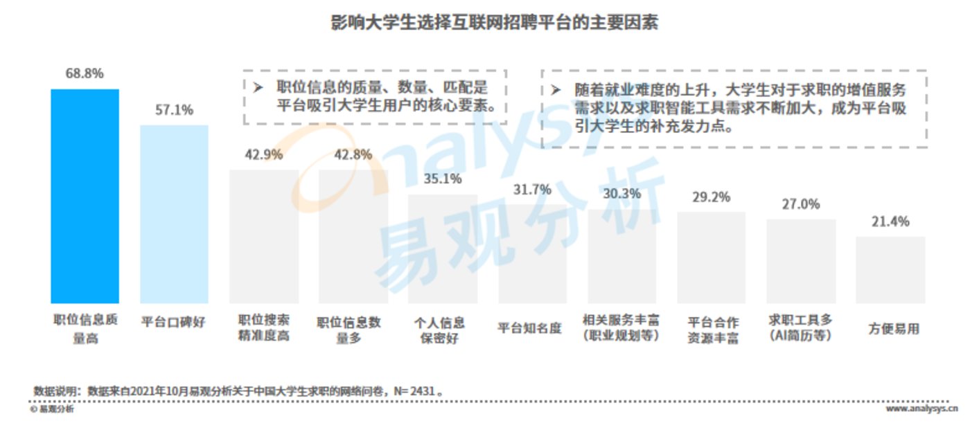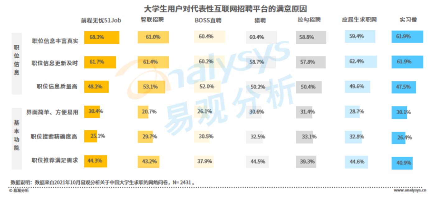 前程无忧51Job基于长期布局积累了丰富的企业资源并建立了完善的审核机制,68.3%的大学生对其职位信息的丰富及真实感到满意;智联招聘基于与政府合作的优势开拓高新技术人才等招聘专场,53.1%的用户对其职位信息质量感到满意。