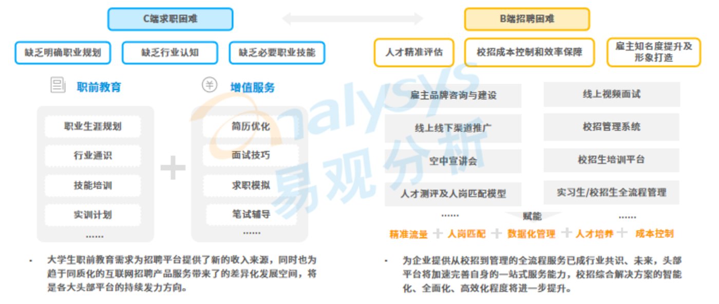面对大学生求职的诸多需求和痛点,大学生职前教育和招聘增值服务成为平台探索新商业模式、形成差异化竞争力的一大发力方向。B端方面,平台通过一站式校招解决方案助力雇主降本提效,在深挖B端客户价值的同时向人力资源综合服务平台发展。