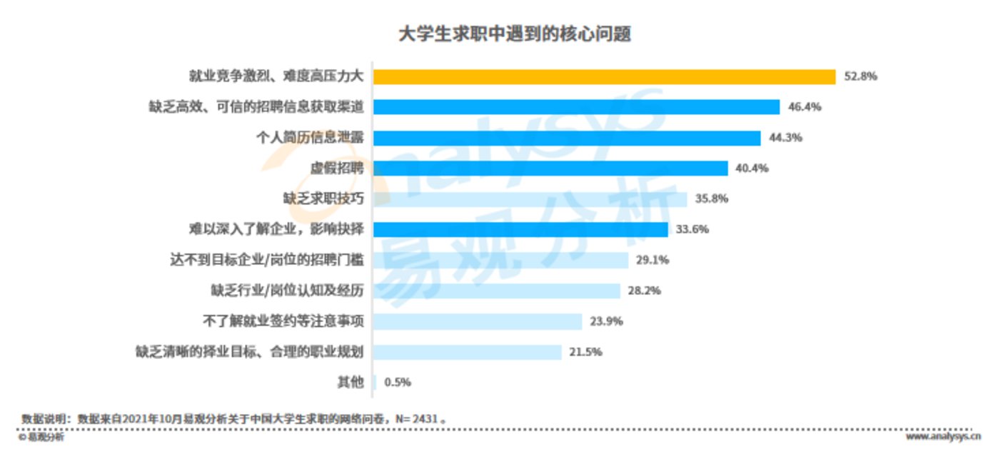问卷结果显示,就业竞争激烈、压力大,是超过半数大学生的核心求职痛点。渠道效率低、消息泄露、虚假招聘等外部因素影响大学生的求职体验;自身缺乏求职经验、能力不足等内部因素使大学生的求职难度增加。