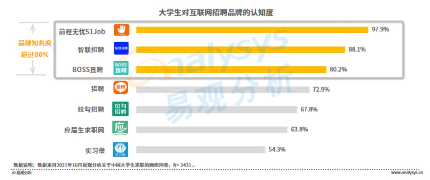 平台认知:前程无忧认知度最高,TOP3认知率均达80%以上