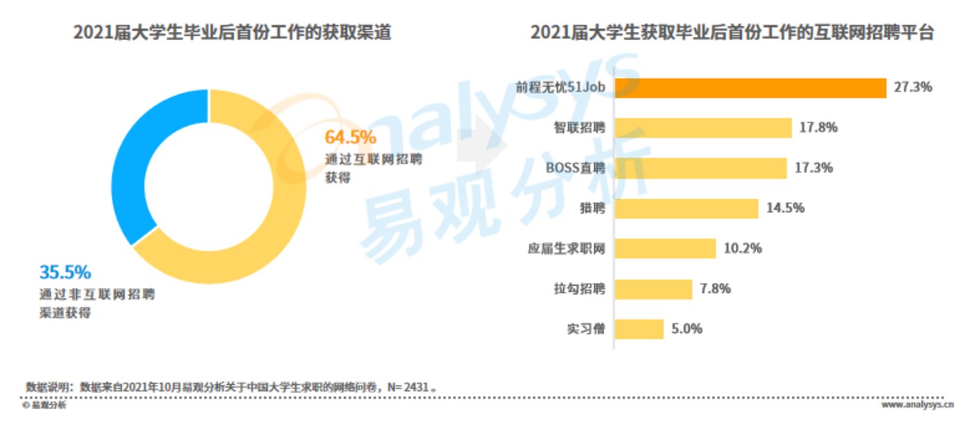 已就业的2021届样本中,64.5%的大学生毕业后首份工作通过互联网招聘渠道获取的。其中,有27.3%的大学生第一份工作通过前程无忧51Job平台得到,通过智联招聘及BOSS直聘获得首份工作的用户均达17%以上。整体而言,互联网招聘平台在大学生毕业求职中发挥了可观的作用;分平台来看,大学生毕业后首份工作多通过头部综合招聘平台获得。