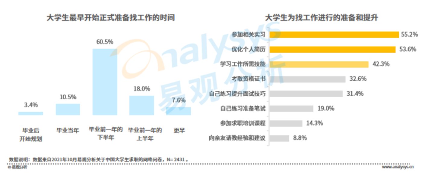 根据调研结果,60.5%的学生在毕业前一年的下半年正式准备求职。由于就业竞争激烈,大学生正式求职时间整体较早,准备期较长。