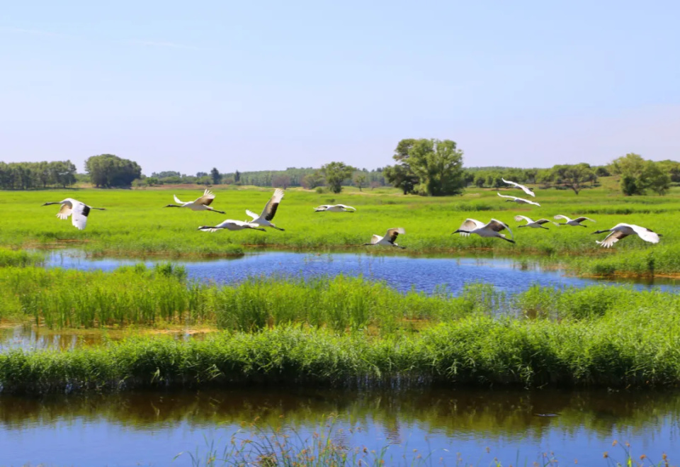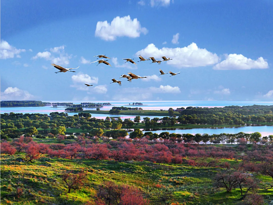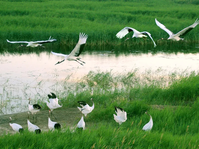 在吉林,素有“东有长白,西有向海”之说。向海原名香海,湖泊、沼泽、水库相间分布,沼泽地上生长着茂密的大片芦苇,大大小小的水泡星罗棋布,每年春天,丹顶鹤、白枕鹤、白鹤、蓑羽鹤、灰鹤、白鹳及许多雁、鸭、鹭、鸥陆续结队而来,被称为 “具有国际意义的自然保护区”。