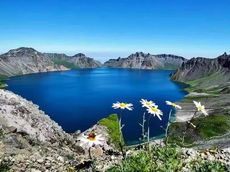 山顶的天池,宛如一面镜子,倒映着蓝天白云,美得令人心醉,站在天池边,感受着微风的吹拂,仿佛可以忘却尘世的烦恼,与大自然融为一体。
