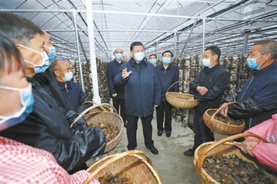 4月20日至23日,中共中央总书记、国家主席、中央军委主席习近平在陕西考察。这是4月20日,习近平在商洛市柞水县小岭镇金米村智能联栋木耳大棚,同村民亲切交流。 新华社记者 鞠鹏摄