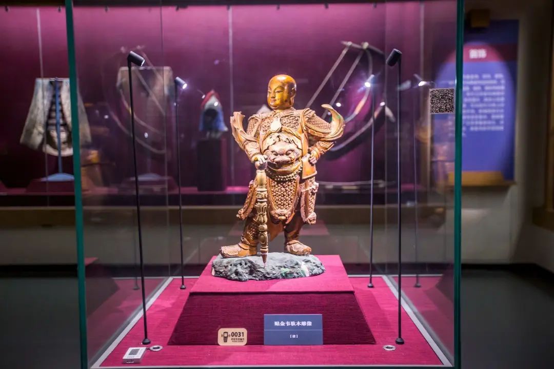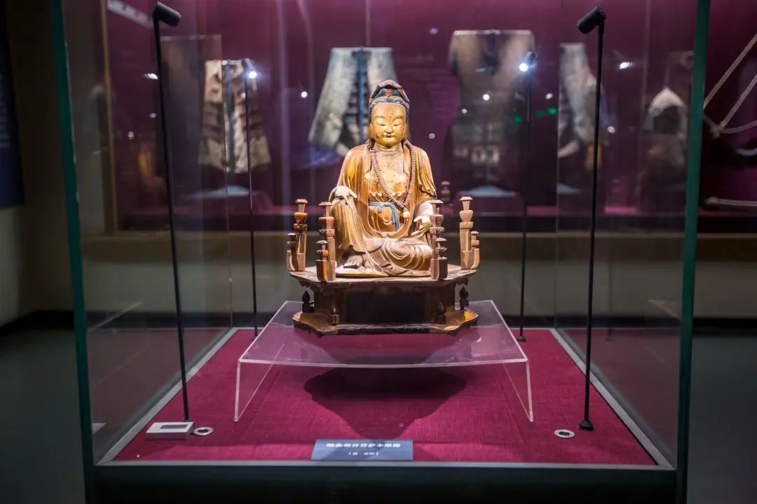 贴金观音菩萨木佛像跟人们印象中的观音似乎有些区别,当时制作此雕像的匠人想必有着相当高的技艺,菩萨五官细腻,表情恬静,所着衣物线条流畅自然,似乎有布匹织物的流动性。
