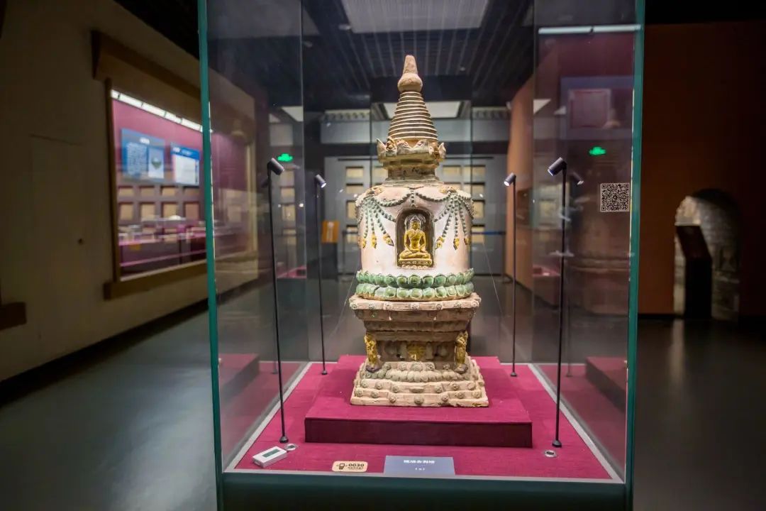 琉璃舍利塔为元代出土,由塔刹、塔身、底座三部分组成,雕刻得相当精巧。塔身正面中间的佛龛内端坐着一尊佛像,塔身施白釉,其它部分则施上了黄、绿两色琉璃釉,虽然已过近千年,颜色依然清晰可辨。