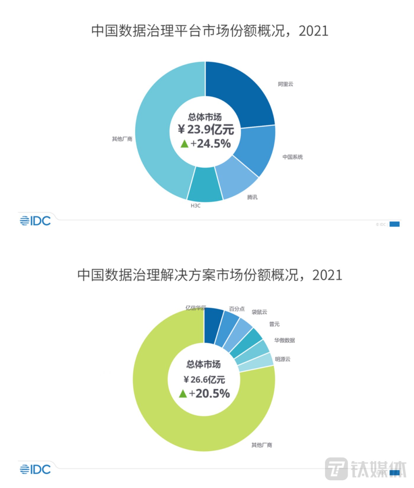 钛媒体App 6月17日消息,近日全球权威咨询机构IDC正式发布数据治理系列报告,IDC将数据治理市场分为数据治理平台市场以及数据治理解决方案市场两大主要市场。 报告显示,数据治理平台市场2021年规模达23.9亿元,阿里云、中国系统、腾讯云、H3C为主要供应商。此外,数据治理解决方案市场2021年规模达26.6亿元,亿信华辰、百分点科技、袋鼠云、普元、华傲数据、明源云为主要供应商。从市场增长角度看,预计2022年的市场规模增长将远高于2021年的年度增长。