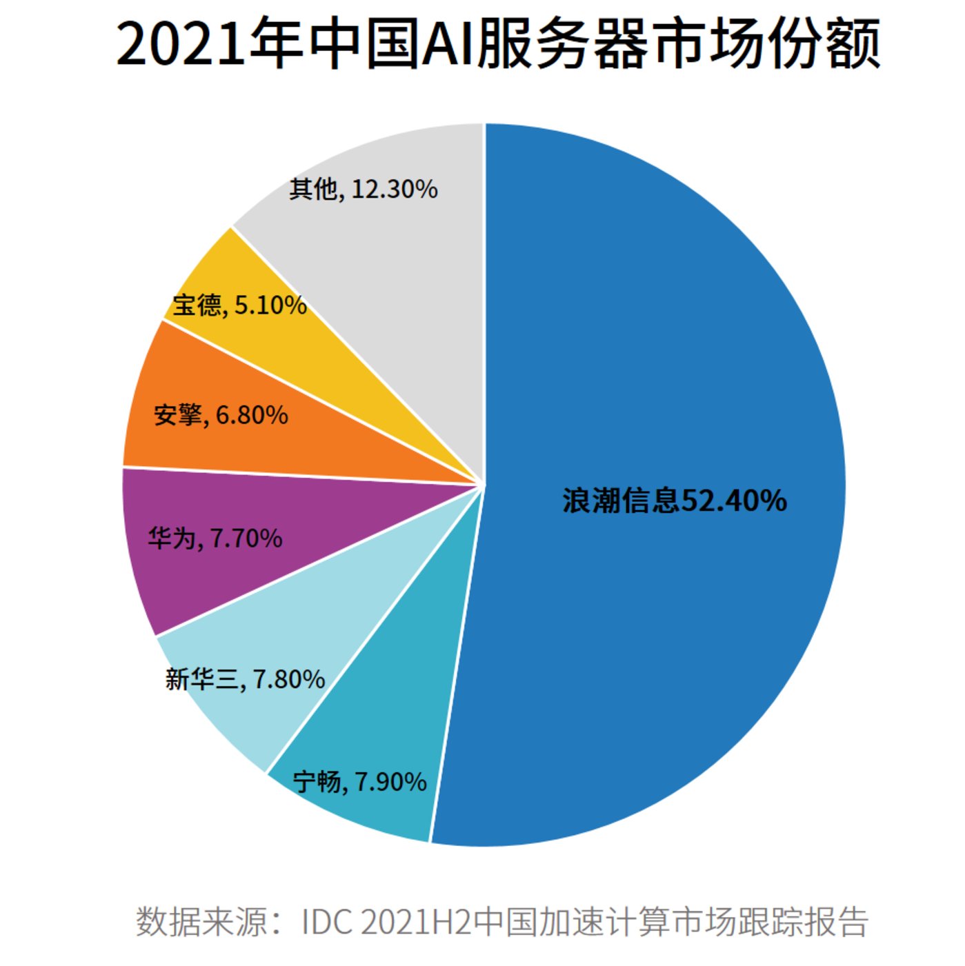 从厂商维度看,浪潮信息、宁畅、新华三、华为、安擎位居前五,占据了82.6%的市场份额。其中,浪潮AI服务器市场占有率达52.4%,连续5年(2017–2021年)市场份额超过50%。