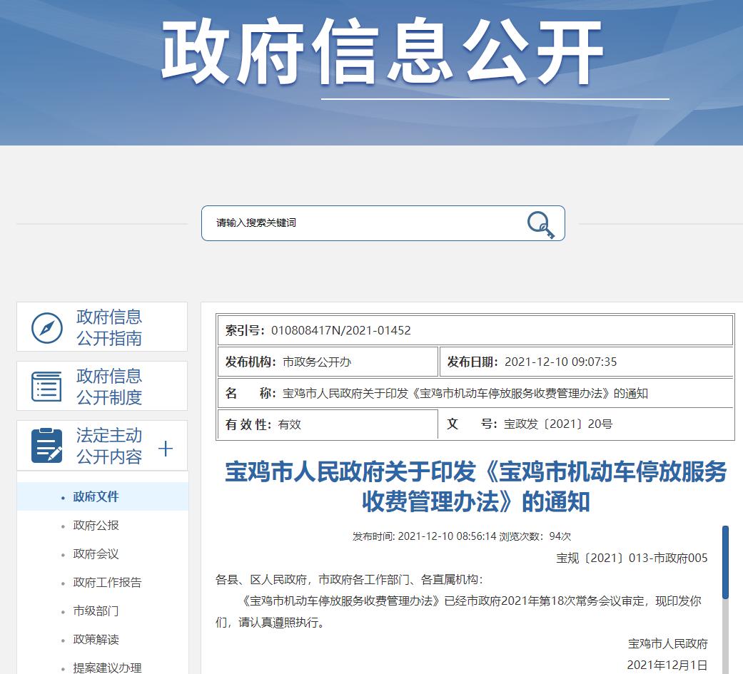 《宝鸡市机动车停放服务收费管理办法》