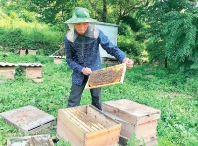 候宝来家里养了45箱土蜂,一年能产蜂蜜300多斤左右。过去,出售蜂蜜要走20公里山路,背到镇上的集市去卖,价格低不说,卖不完还得背回家。2015年以来,经驻村干部协调,不出村子,他家生产的几百斤蜂蜜通过镇里和村里的网店全部被卖了出去,一年能收入2万多元。