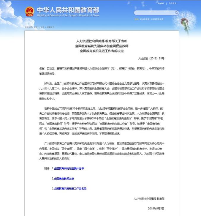 9月9日,教育部官网发布了《教育部关于表彰全国优秀教师和全国优秀教育工作者的决定》和《人力资源社会保障部 教育部关于表彰全国教育系统先进集体和全国模范教师全国教育系统先进工作者的决定》。授予597个单位“全国教育系统先进集体”称号、718名同志“全国模范教师”称号、79名同志“全国教育系统先进工作者”称号、1432名同志“全国优秀教师”称号、158名同志“全国优秀教育工作者”称号。被授予“全国模范教师”和“全国教育系统先进工作者”称号的人员,享受省部级表彰奖励获得者待遇。