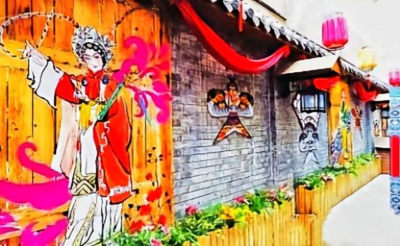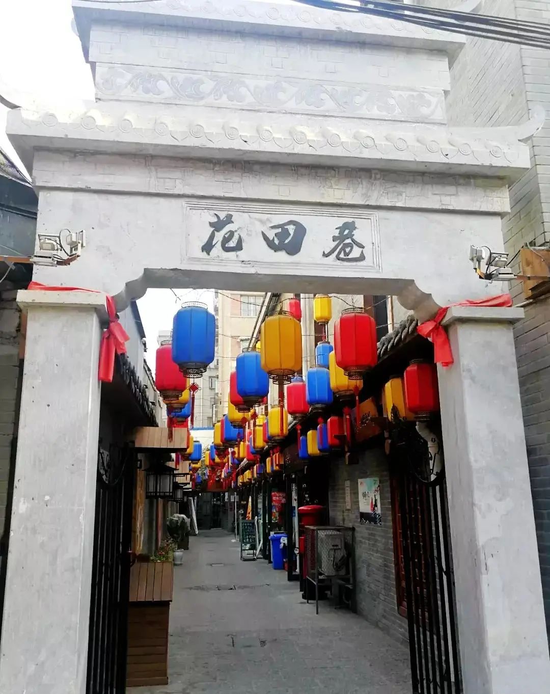 巷子门口是青石拱门,正上端刻写着“花田巷”三字牌坊,巷子曲折,在门口能看到的只是很少一部分,拐进去才能看到热闹繁华的美食街。进了大门,空中悬挂的红黄蓝灯笼整齐划一,一直延伸到尽头。巷子的墙面是用青石铺成,墙上刻画着各式各样的风筝,京剧人物等。门口人力车的雕塑似乎在招呼过往的游客,街道两边火红的灯笼充满了温馨气息,花色迥异的木窗与浪漫别致的花卉相得益彰。