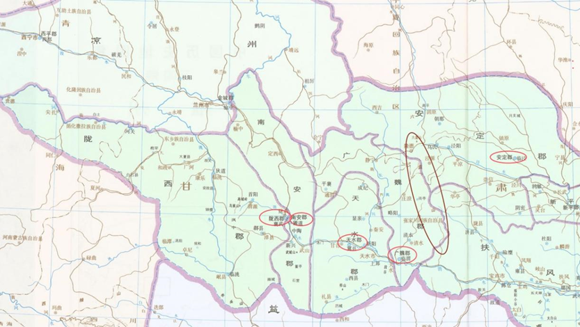 古人以西为右,陇西又称陇右。魏国在陇山以西设置了陇右五郡,包含:陇西、天水、南安、广魏、安定五郡。