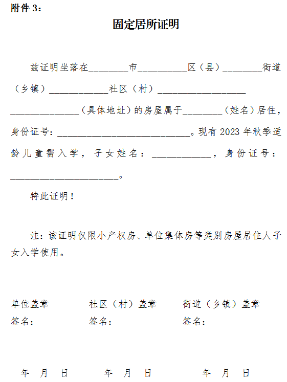 6.小产权房需提供由社区、街办审核签字盖章的《固定居所情况说明》;单位集体房需提供由单位和社区、街办审核签字盖章的《固定居所情况说明》。(详见附件3)