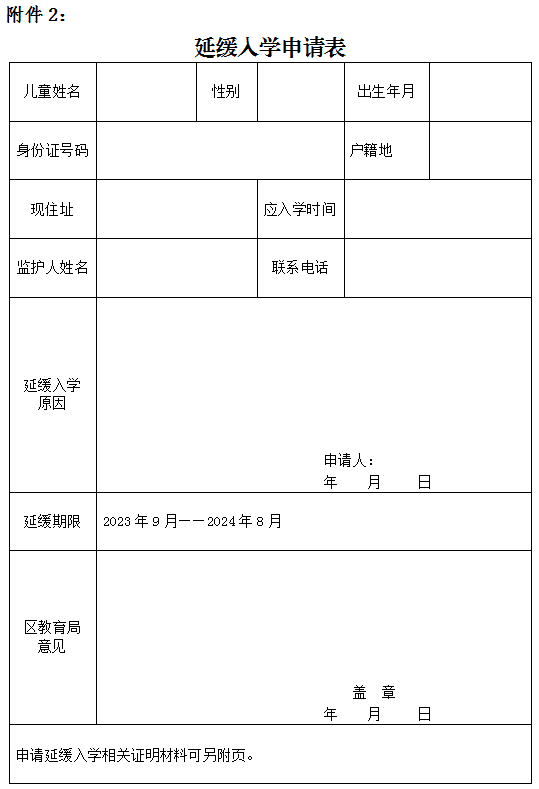 4.已年满6周岁(即在2017年8月31日前出生的)的适龄儿童,应办理入学手续;确需延缓入学的,可填写《延缓入学申请表》到户籍所在乡镇(街道)、区文教卫局办理延缓入学手续。