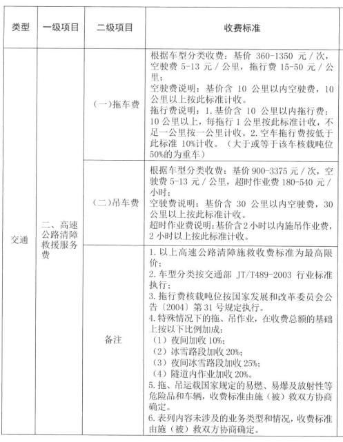 根据车型分类收费:基价360-1350元/次,空驶费5-13元/公里,拖行费15-50元/公里;