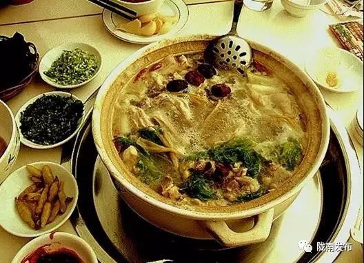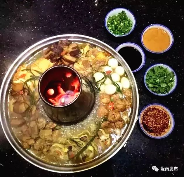 暖锅是一道色香味俱全的特色名吃,主要食材是肉、鲜菜、干菜、粉条。不论在菜馆、酒楼,还是家庭聚餐,桌上有此佳肴,暖人心窝。此菜选料多样,有荤有素,以熟料为主,讲究刀工,注重造型。来陇南,怎能错过这道美食呢!