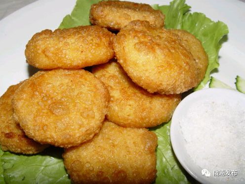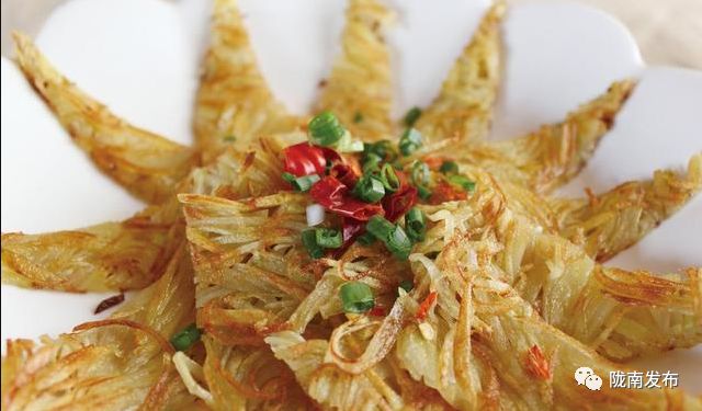 洋芋饼。将洋芋擦丝,放入平锅内,烙成饼状,加入少许盐水,色泽金黄,口感香脆。