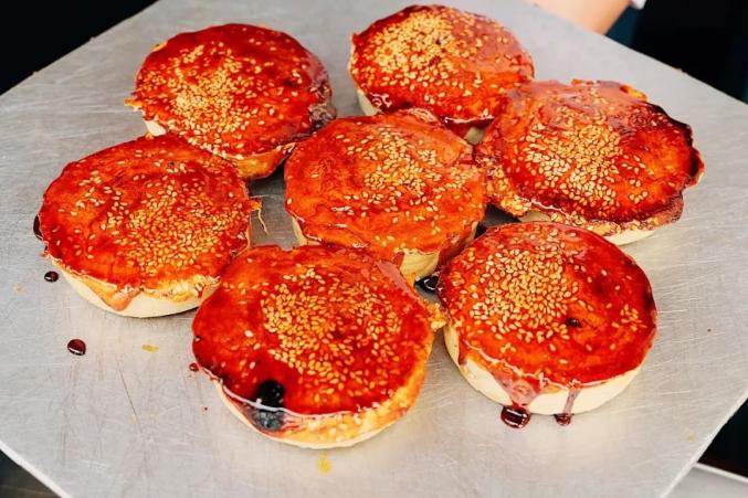 现做现卖的鲜肉月饼,朴实的酥皮里,包裹着新鲜猪肉,咬一口还有温热的汤汁溢出,美味无比!