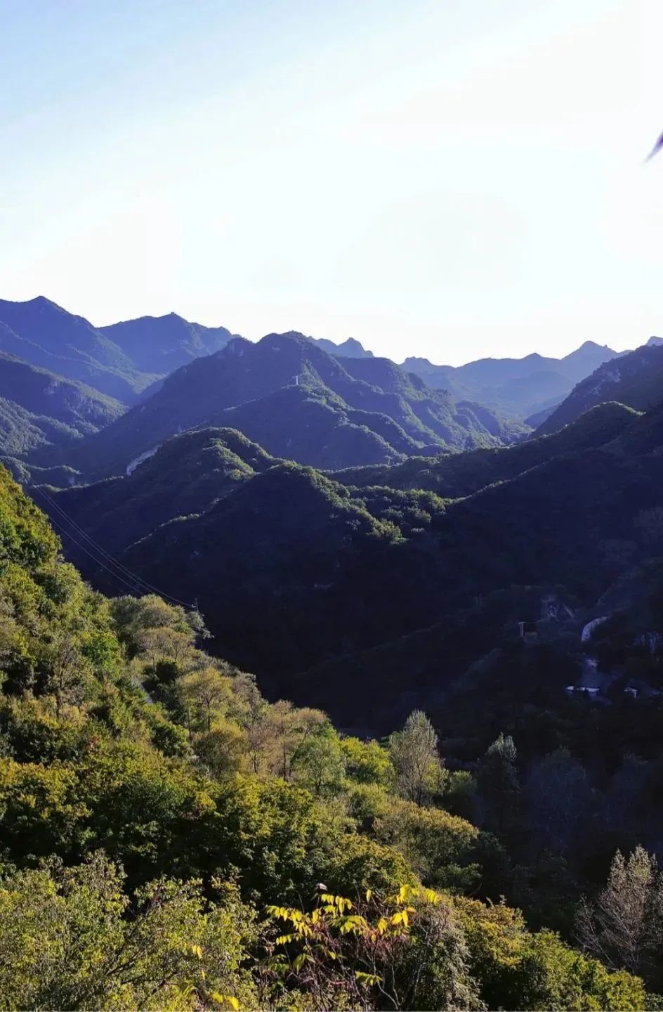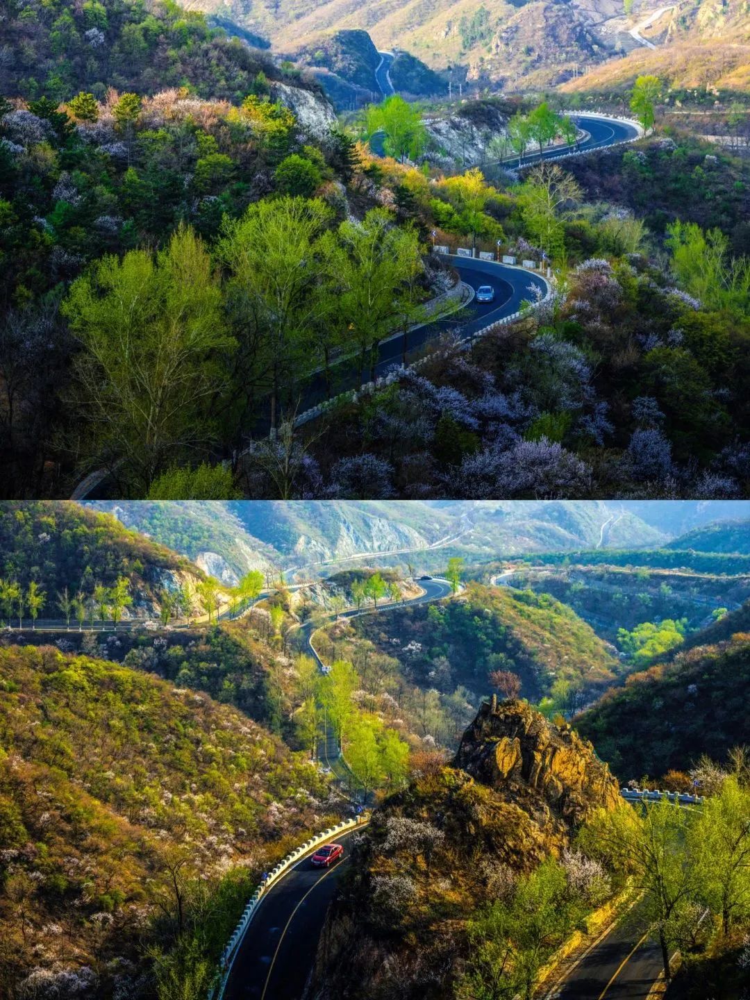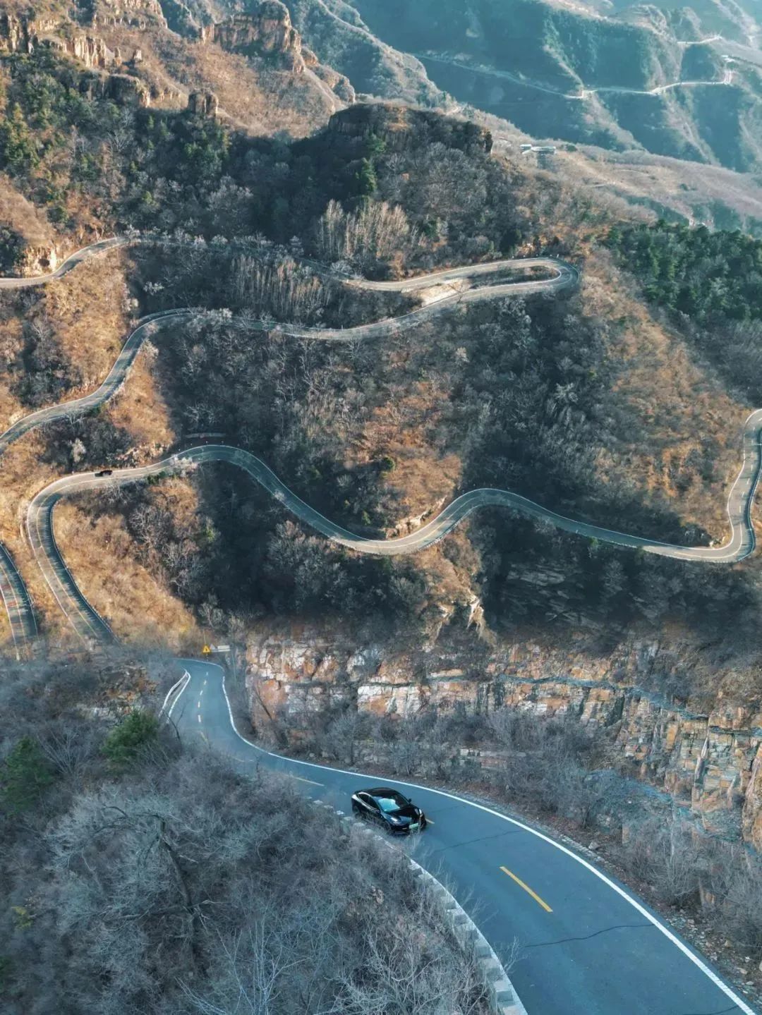 北京境内,从长陵镇开往延庆区大庄科乡的路上全是盘山道,上到山顶再下到山脚。局部路段一侧是山,一侧是山谷,视野开阔,景色壮观。