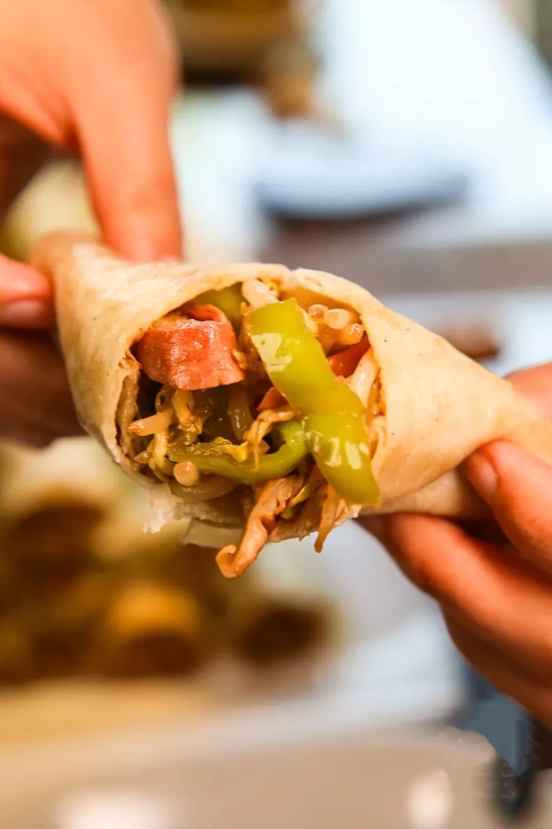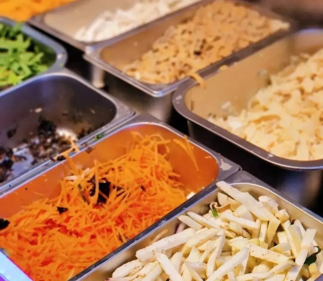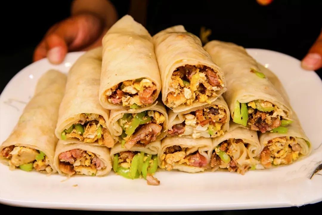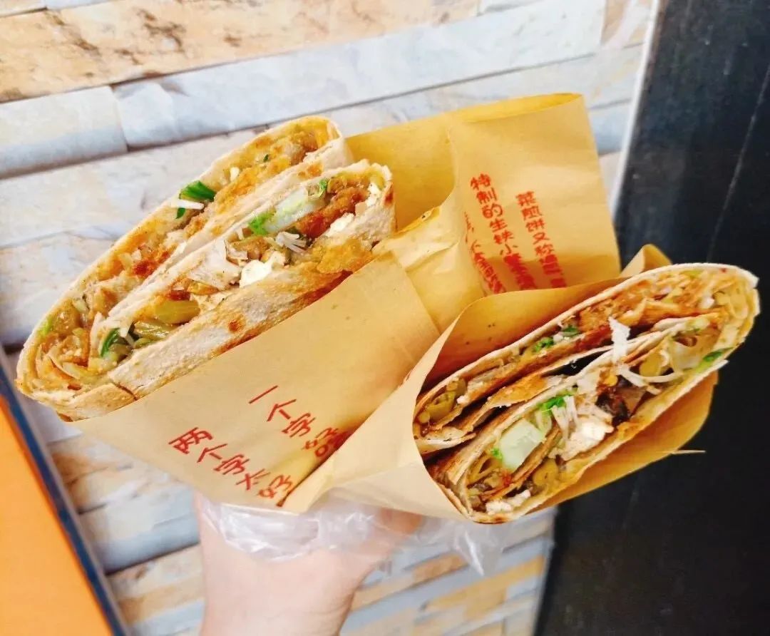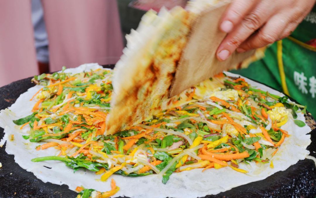 一张自制的煎饼里面包裹着各种蔬菜,萝卜、白菜、粉条、火腿……五颜六色,朴素中带着些食欲,独树一帜,深得食客喜欢。