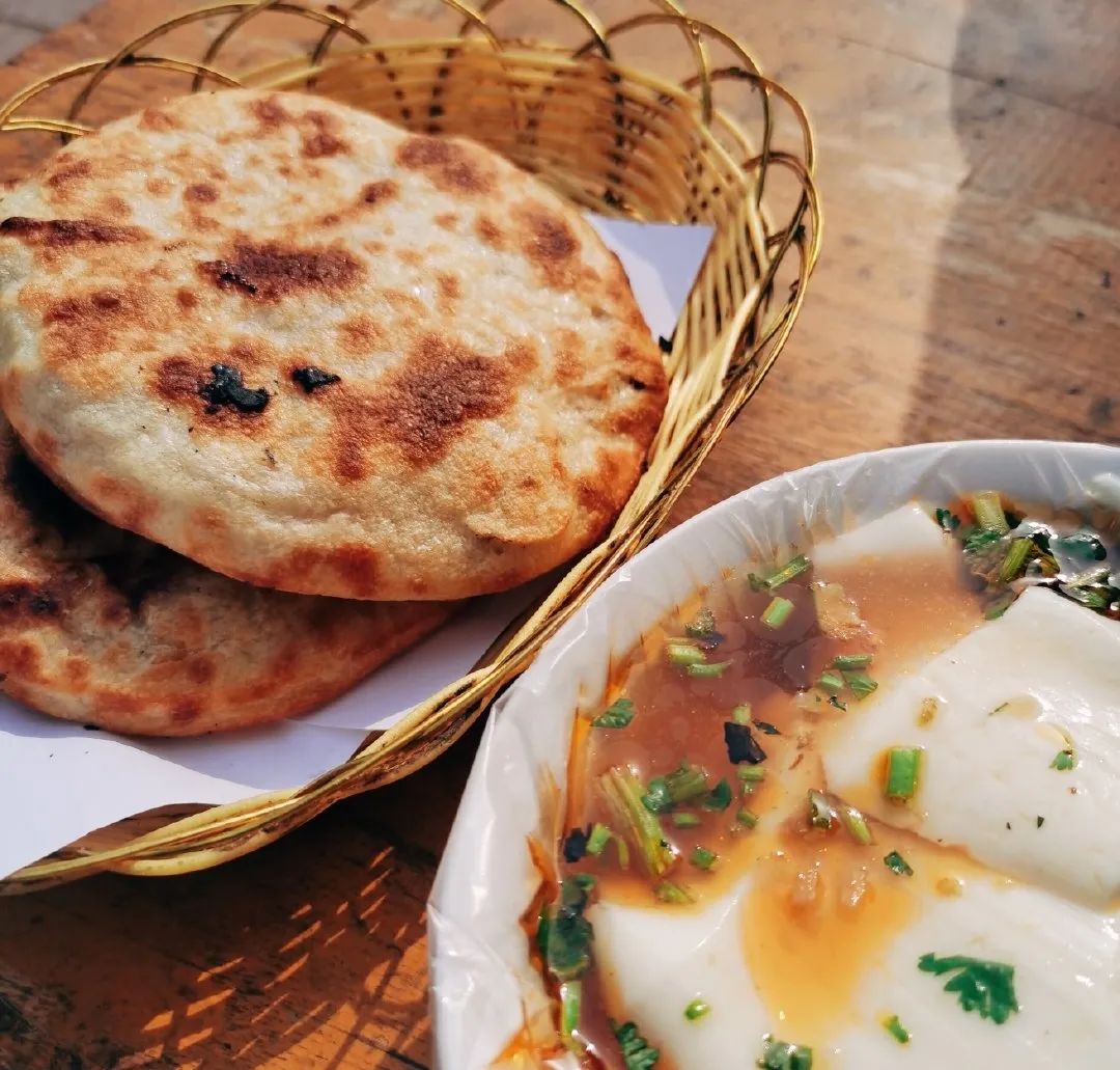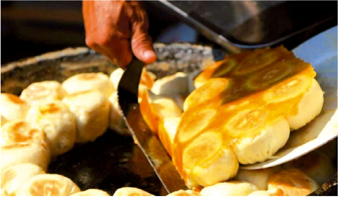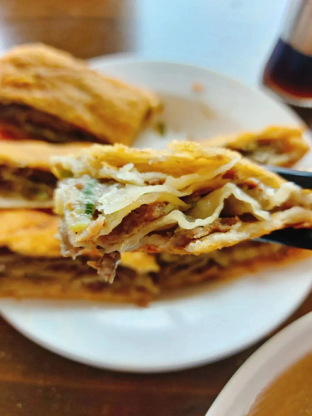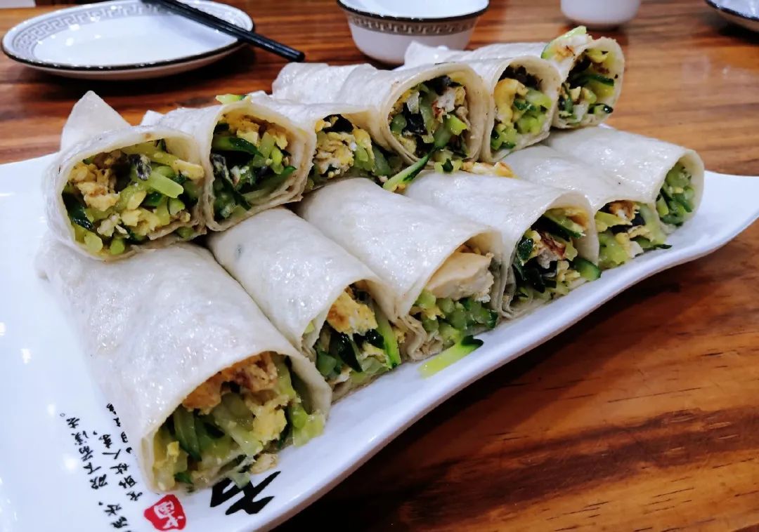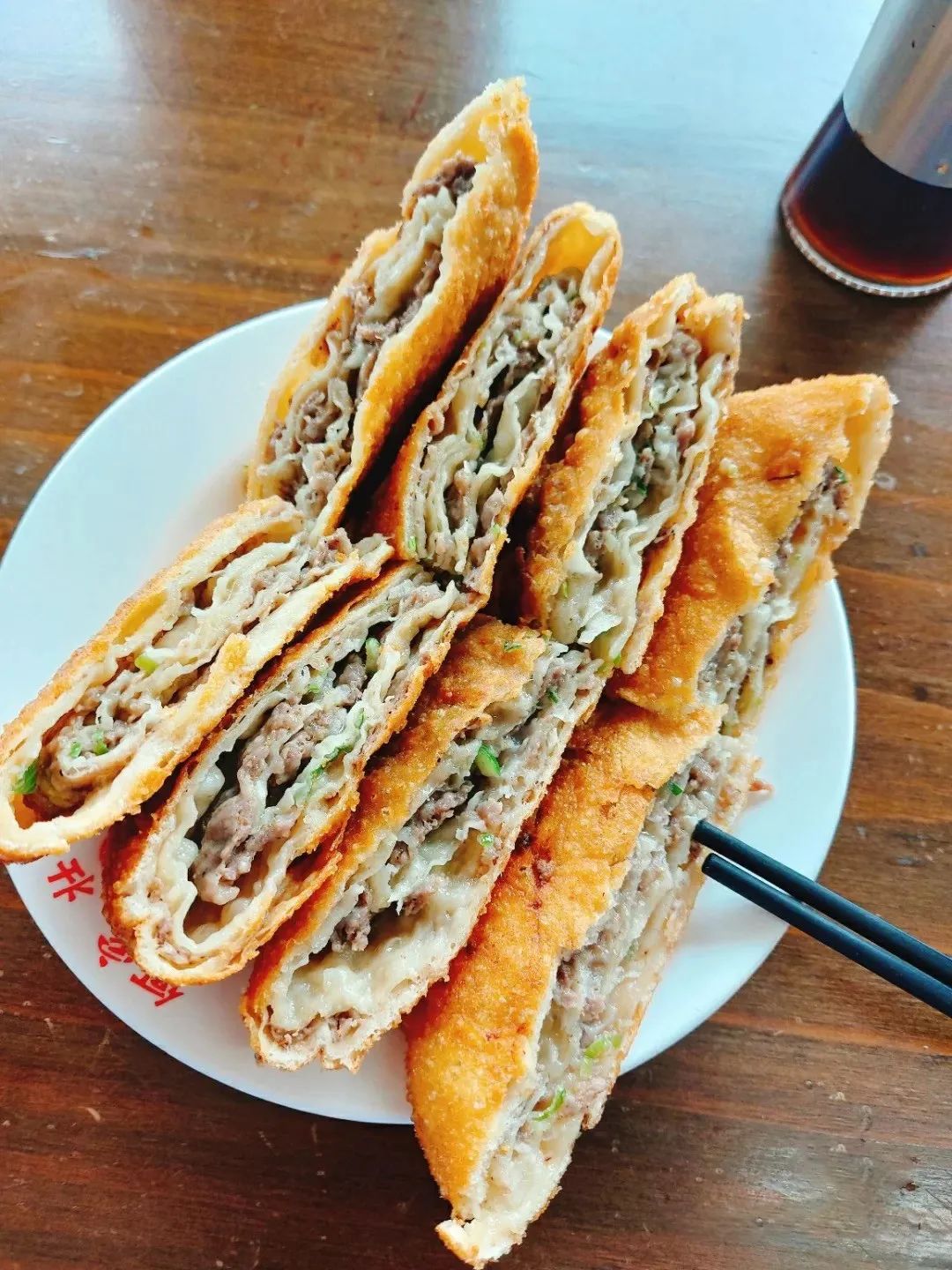 滚烫的炉火上,一张张绵薄筋道的面饼平摊开来,一大锅荤素搭配的馅料翻炒拌匀,裹进那精致小巧的面饼中,再切成大小均匀的几段,盛盘入席。