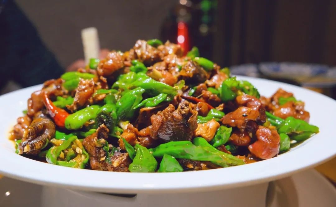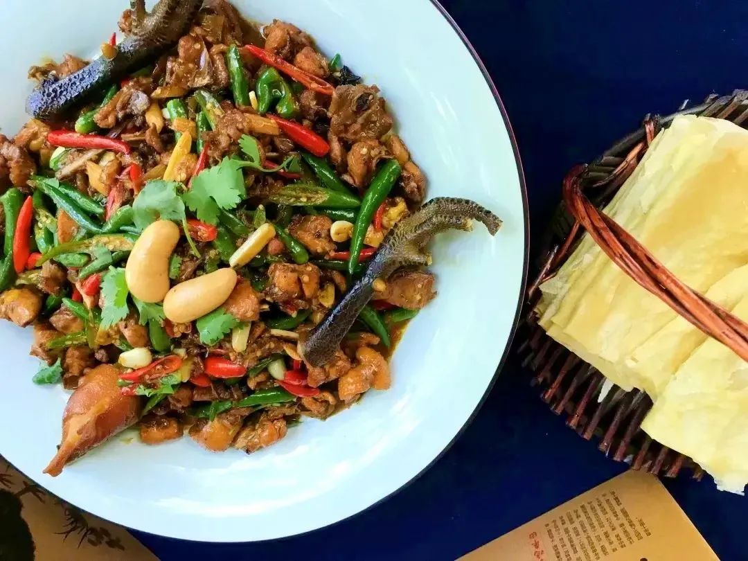 本地的小公鸡加尖辣椒,出锅时撒上一小把芫荽,一口下去,辣味与鸡肉香味充斥于唇齿之间,鲜嫩可口!