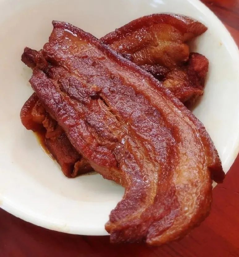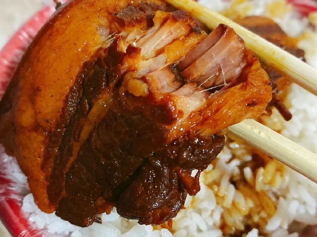 这一块长条五花肉,浓油赤酱、五花三层、入口即化,肥肉不腻,连肉带汤浇在白米饭上,这滋味儿,就一个字,香!