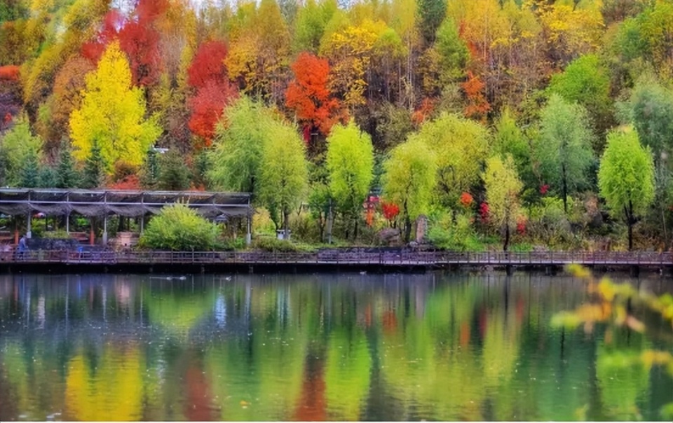 人间瑶池境,唯美大龙湾。湖岸边的山坡上,金黄的枫桦、火红的枫叶、浓绿的松树,缤纷的色彩在此交织,绘就一幅秋日盛景。
