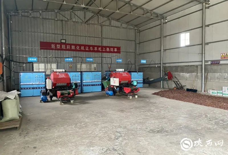 在陕西峻成智慧牧业科技有限公司生产车间,“新型秸秆膨化机让牛羊吃上熟饲草”的标语格外醒目,5台设备同时运转,一天可生产60吨熟饲草。