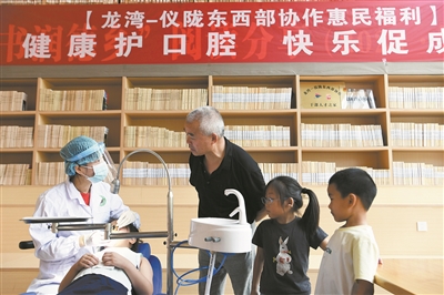 温州网讯 “小朋友,你有烂牙的情况,记得每天要以正确的方法刷牙哦。”8月29日下午,当记者到四川仪陇县的德园城市书房采访时,巧遇来自温州龙湾区第一人民医院口腔科的医生夏益枫,在城市书房的“公益讲座区”做“龙湾—仪陇东西部协作惠民福利”的义诊。夏益枫语气温柔地对20多位前来参加检查的6-10岁孩子嘱咐道。