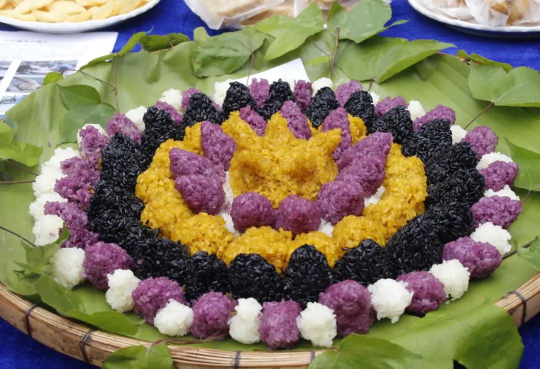 花米饭是布依族在“三月三”祭祖必须上桌的供品,祈求避灾免祸,来年丰衣足食。食用的方式由单一走向了多样,或蒸,或煮,或焖,或炒。五颜六色代表了布依族对色彩的追求,利用植物浸泡染色,表达了布依族崇尚自然的心理,花米饭中自有一股独特的植物清香。