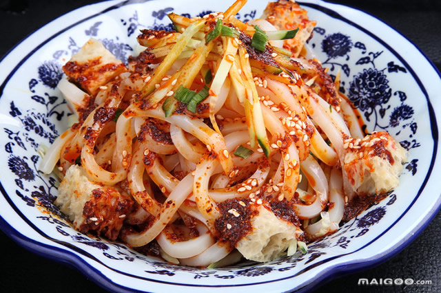 青海酿皮是青海地方风味较浓的传统小吃,在西宁和农业区各城镇出售酿皮的摊贩到处可见,其绵软润滑、酸辣可口、爽口开胃。青海酿皮是青海一张响亮的美食名片,而洋芋酿皮更是被中国旅游协会评选为“中国金牌旅游小吃”。青海酿皮是在麦面中掺和一定数量的蓬灰和敷料,用温水调成硬面团,再几经揉搓,等面团精细光滑后放入凉水中连续搓洗,洗出淀粉,面团成为蜂窝状物时,放进蒸笼蒸熟,这叫“面筋”,再将沉淀了淀粉糊舀在蒸盘中蒸熟,这便叫“蒸酿皮”。蒸熟了酿皮,从盘中剥离,切成长条,配上面筋,浇上醋、辣油、芥茉、韭菜、蒜泥等佐...料,吃起来酸辣、凉爽、口感柔韧细腻,回味悠长。 【 详细>>】