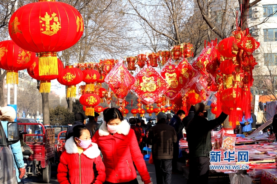 2月1日,甘肃张掖钟鼓楼附近的年货摊生意兴隆。当日是农历腊月廿三,传统的小年,地处甘肃河西走廊中部的古城张掖城乡从这一天开始年味愈来愈浓,火红的对联、火红的灯笼、火红的中国结、火红的福字挂满年货摊,整个古城被浓浓的年味包裹。新华网发 (陈礼 摄)
