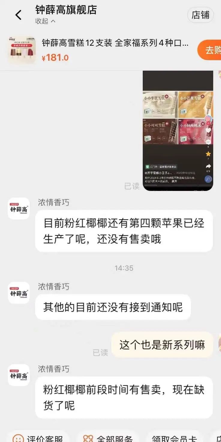 图注:钟薛高官方旗舰店客服回应新品上新相关事宜。