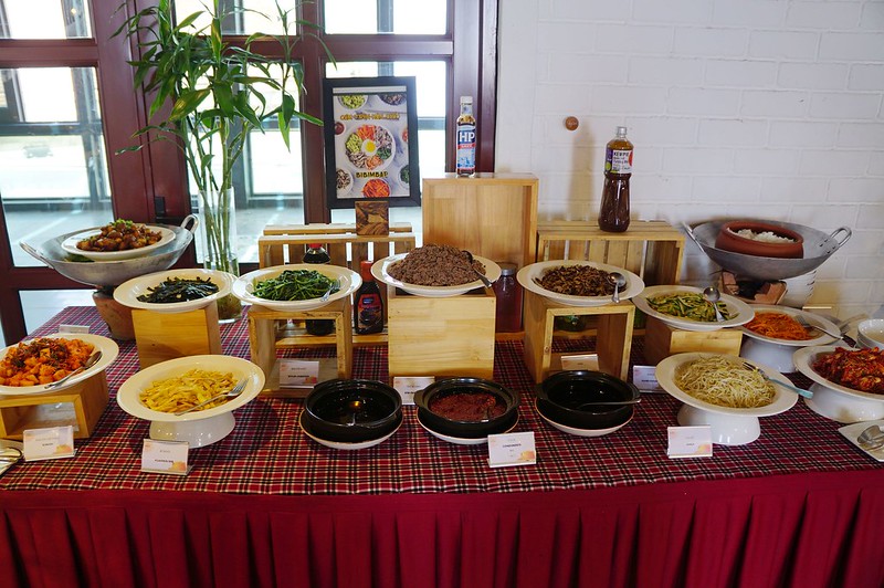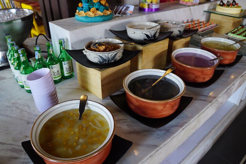 雖然是韓式自助餐,其實日式、中式、西式、越式餐點都有。其中最吸引我的就是韓式拌飯,鋪在飯上的配料超級多,先鋪好肉、青菜、蛋絲、豆芽菜、泡菜,然後放上一顆半熟荷包蛋,再撒上海苔絲、擠些辣醬,就是好吃的拌飯。