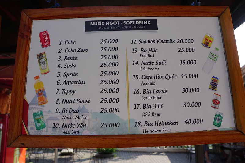 啤酒40,000VND,Acafela咖啡50,000VND,其他瓶裝水、果汁、碳酸飲料都是30,000 VND。