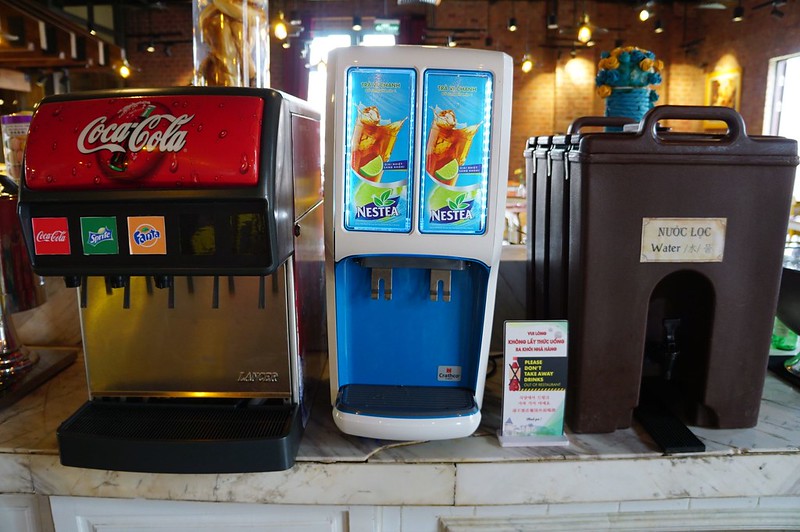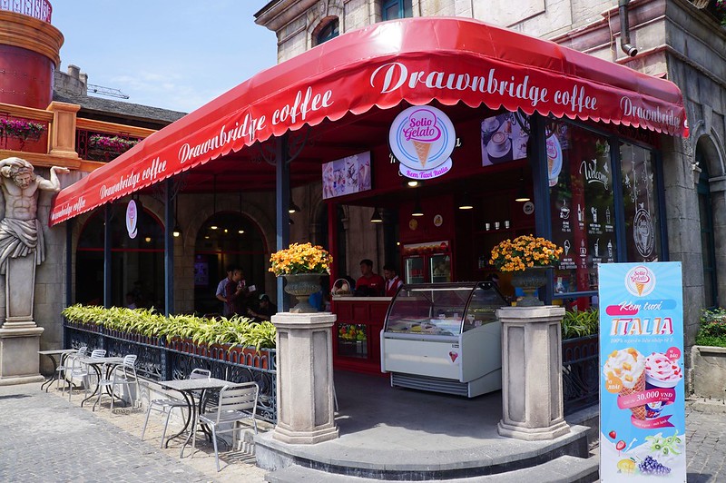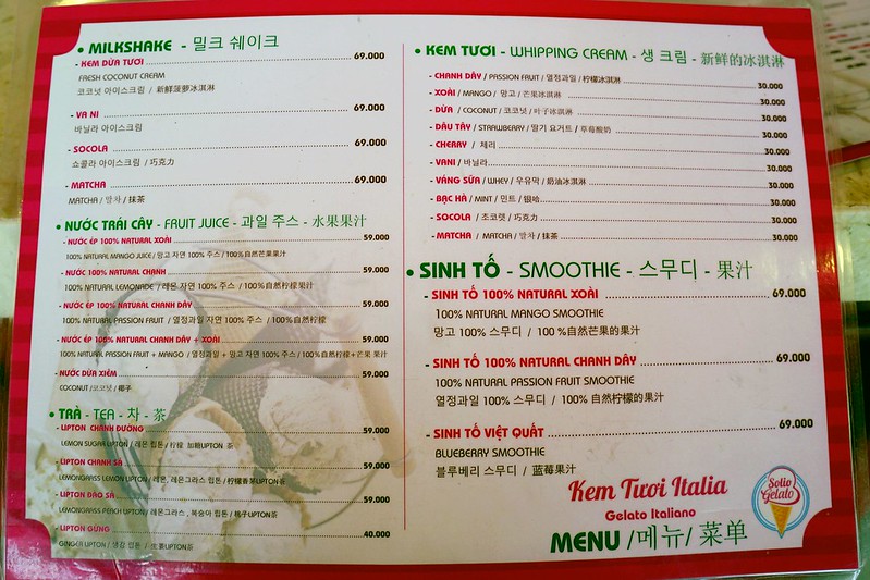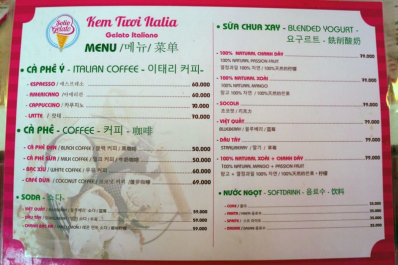 圓形噴泉廣場旁的這間咖啡館有賣義式冰淇淋(Gelato),一球30,000VND。飲料的部分,可樂之類的碳酸飲料35,000VND,咖啡50,000~70,000VND,果汁59000VND,奶昔、果昔69,000VND,幾乎都在台幣百元以內。